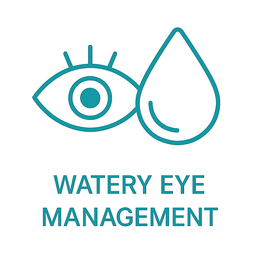 Watery eye management, including probing and syringing, helps diagnose and treat tear drainage obstruction by clearing blockages in the nasolacrimal duct.