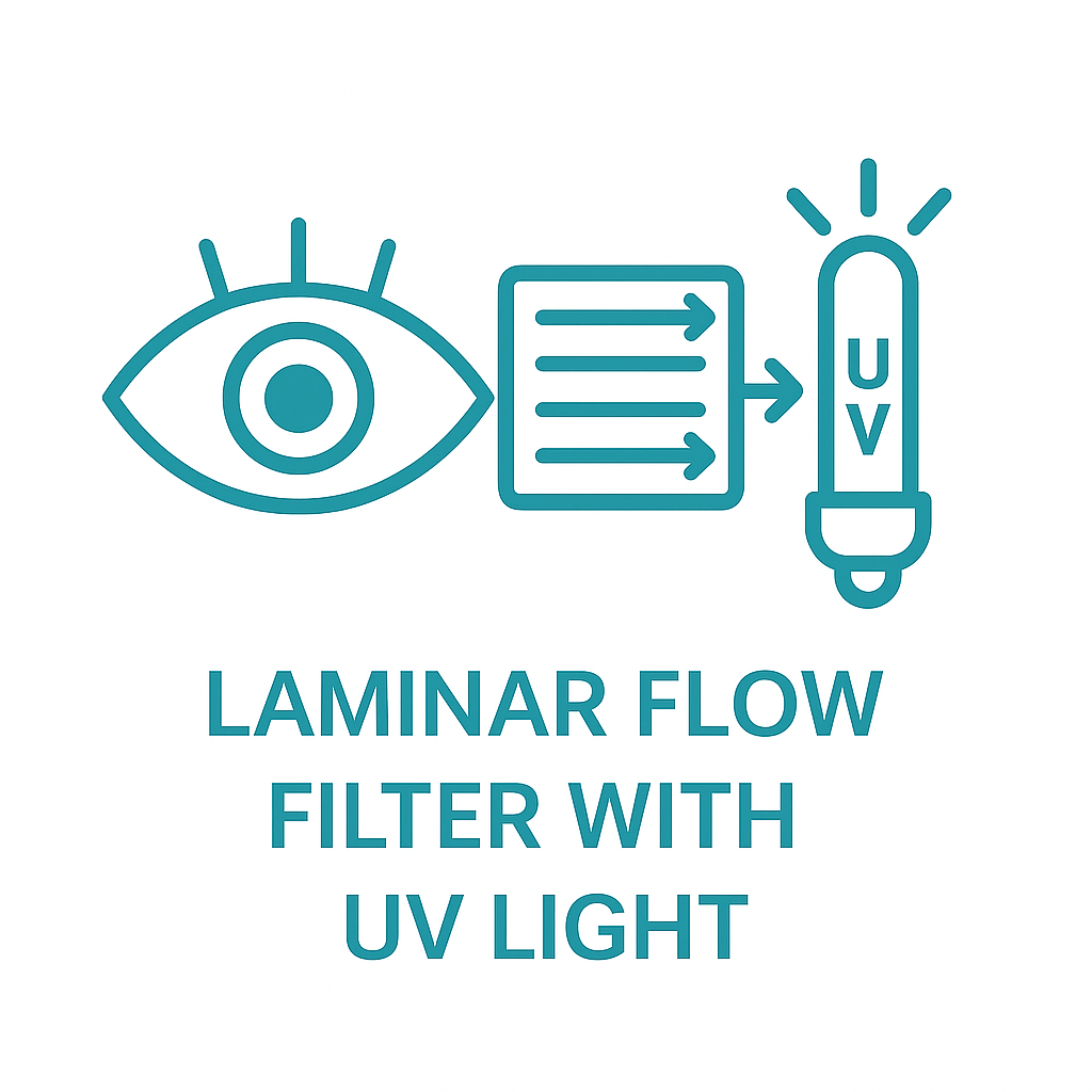 Laminar flow filters with UV light ensure a sterile, particle-free environment critical for aseptic filling of anti-VEGF injections.